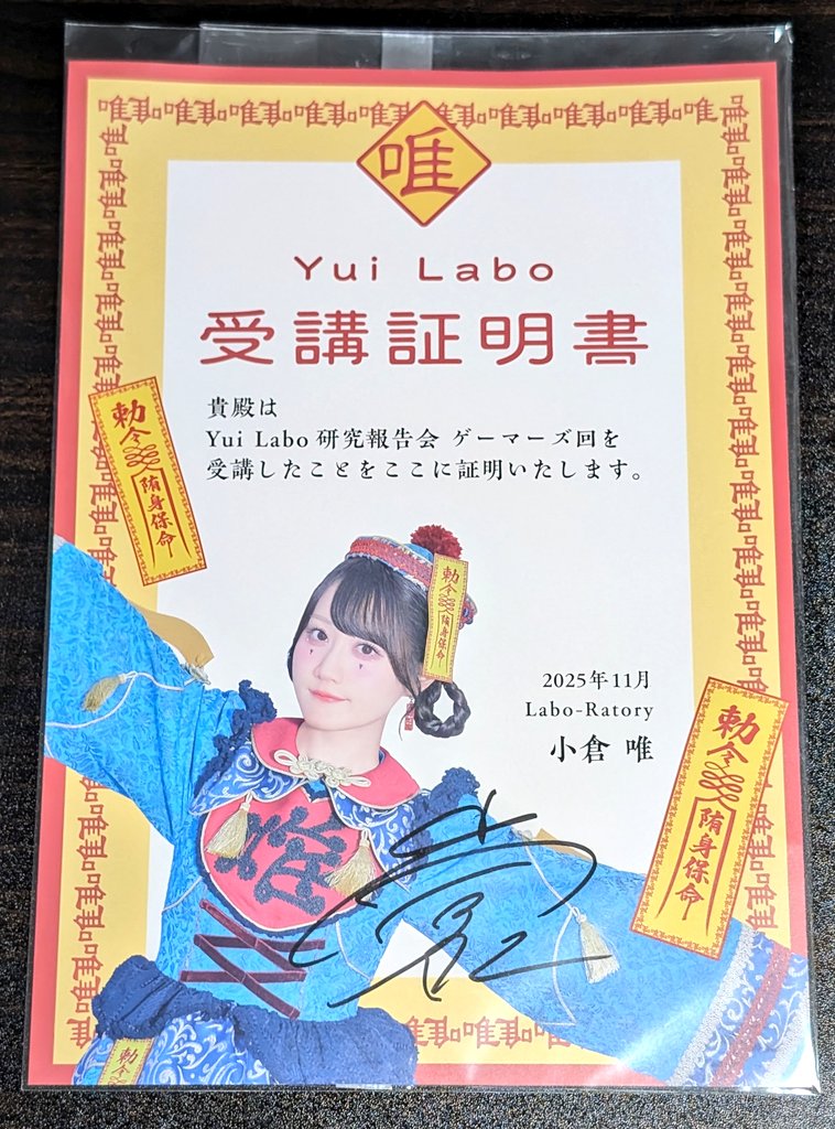 - 研究を手伝ってくれた研究員のみんなにもプレゼント,リリイベで渡していた受講証明書に唯ちゃんのサインを入れてくじで3名様にプレゼント
